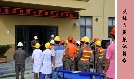 2016年7月2日下午16:30分,按照演练计划各部门参加演练人员准时到综合楼集合待命。此时,调度室发出预警警报,险情就是命令,现场人员疏散组在接到演练总指挥的命令后,立即组织人员按预案分配任务进行救援。应急救援组、物资后勤保障组、医疗救护组、携带抢险工具迅速赶赴救援现场紧急集合,并在指定的抢险地段开展救援工作。